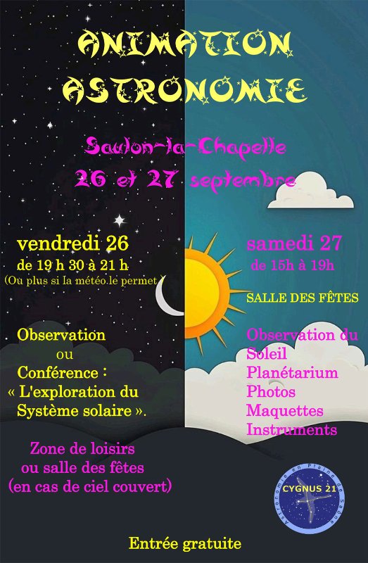 Cygnus 21 vous invite à son animation astronomie à Saulon-la-Chapelle le vendredi 26 et le samedi 27 septembre.